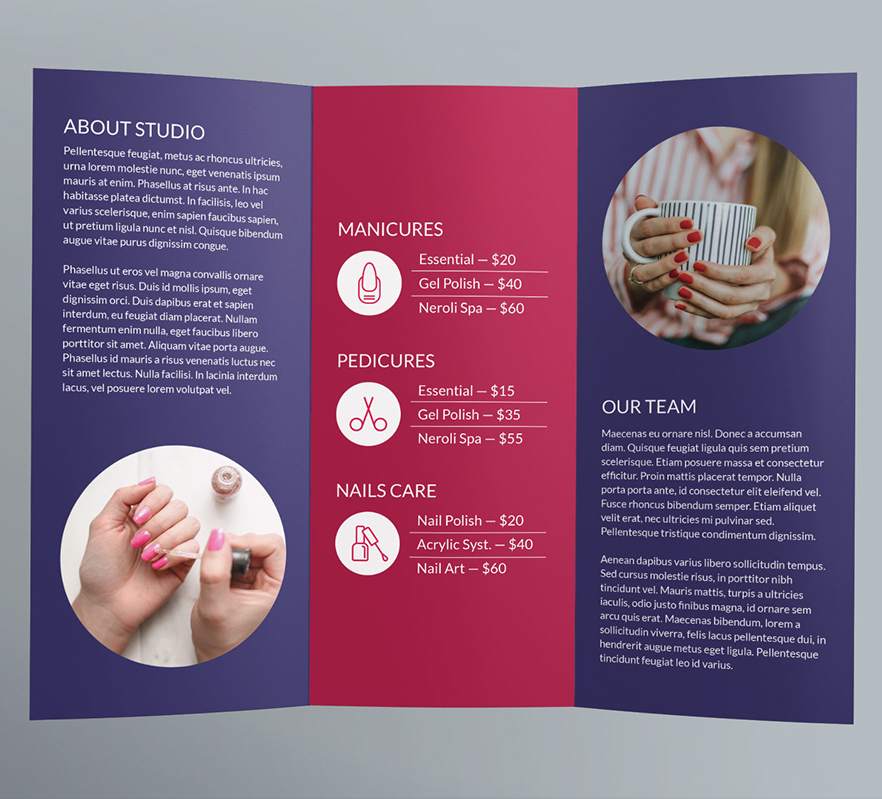 برای طراحی یک بروشور تبلیغاتی برای خدمات ناخن، میتوانید از رویکردهای زیر استفاده کنید: